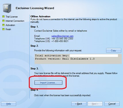 On the Offline Activation screen, click the "Import License…" button and select the license file sent by our sales team. Click "Next" to activate your trial license.